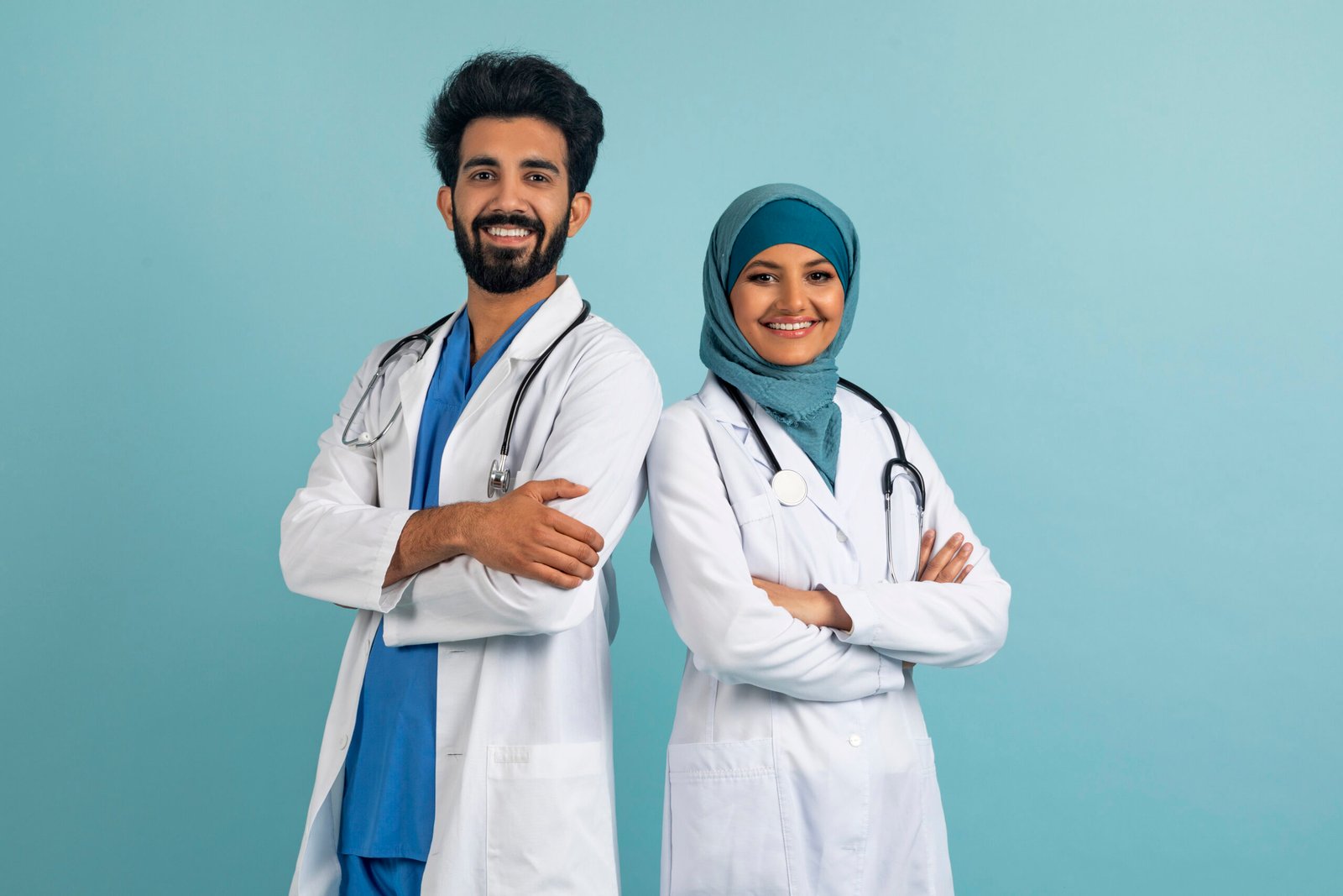 Happy arab doctors man and woman in hijab posing with folded arms, friendly medical workers wearing lab coats standing over blue studio background, looking and smiling at camera, copy space