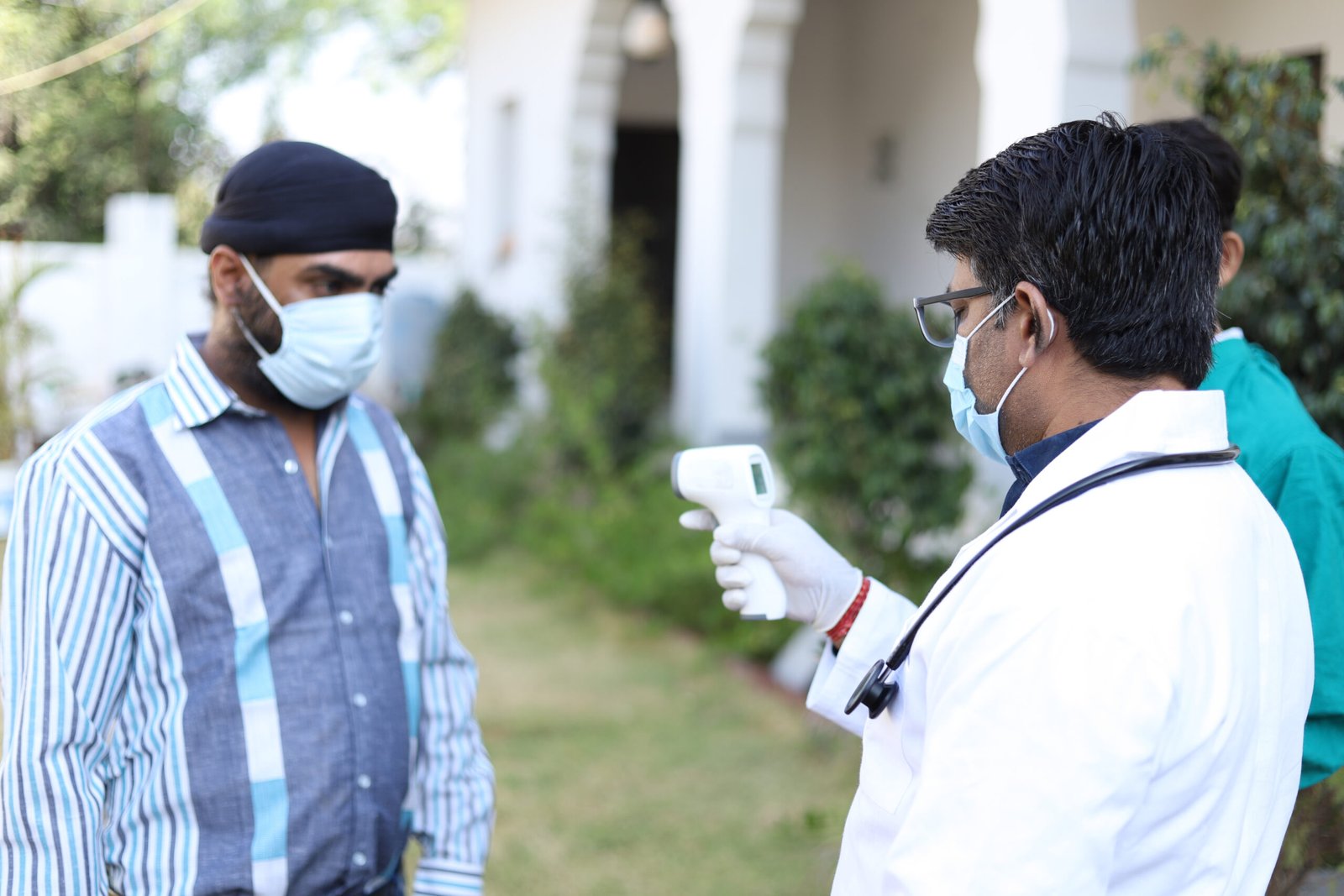 A health worker checking visitor’s temperature using infrared digital thermometer before entering facility