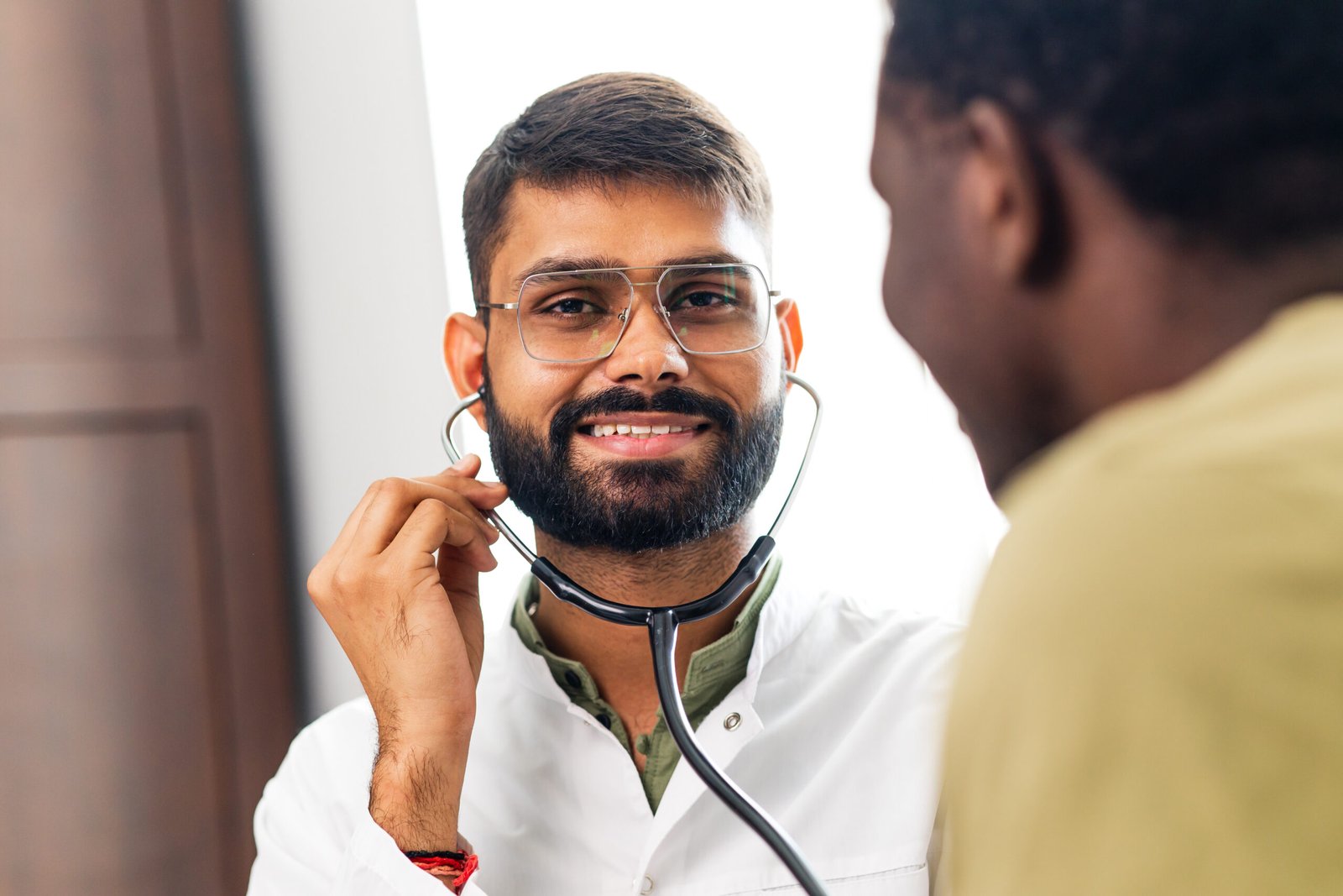A smiling doctor, adorned in a white coat and stethoscope, poses outside a modern building, radiating professionalism and approachability.