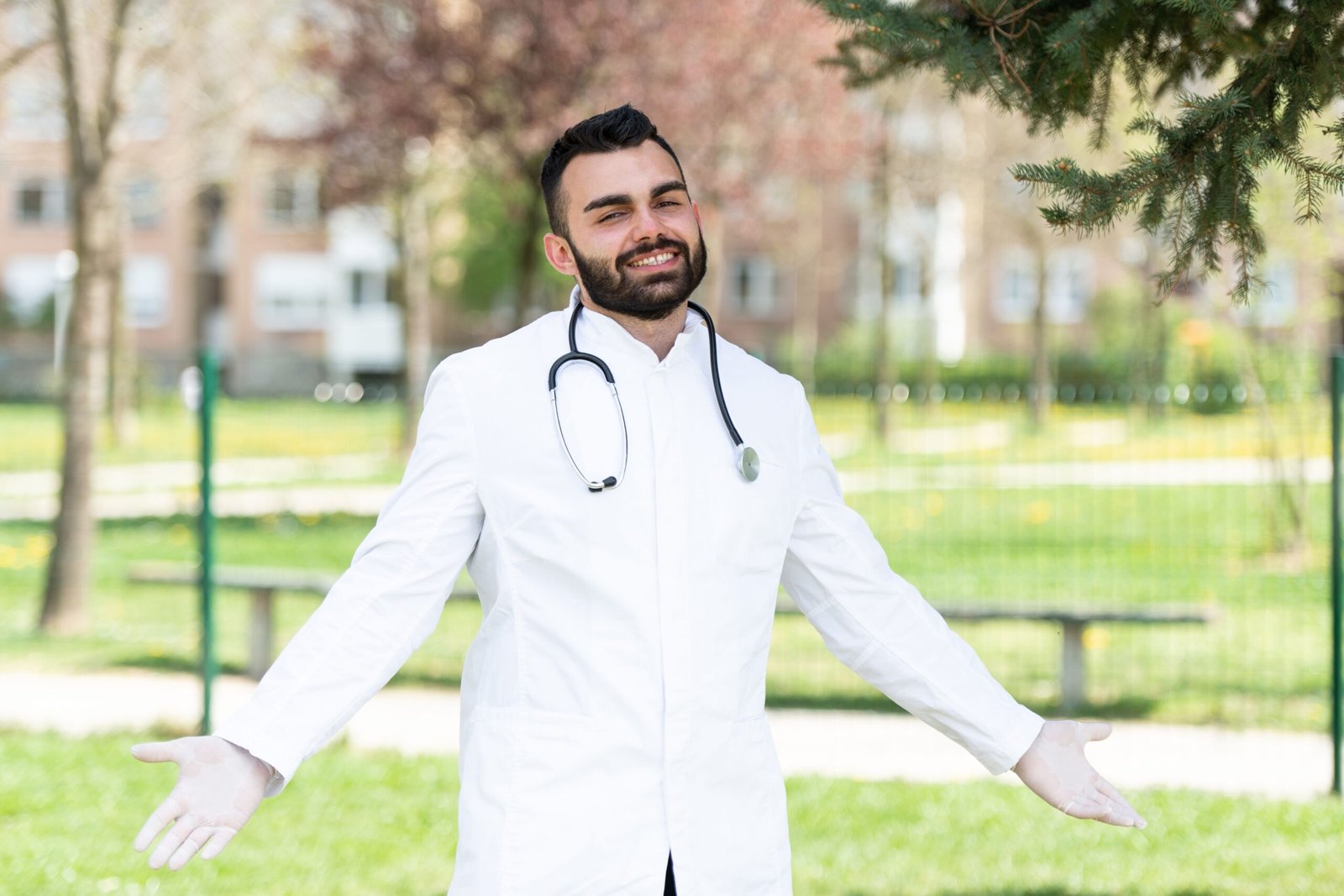 A portrait of a doctor wearing a lab coat and gloves in a park during daytime
